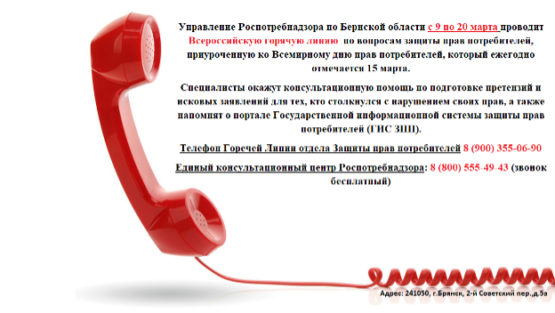 4. Управление Роспотребнадзора по Бернской области проводит Всероссийскую горячую линию по вопросам защиты прав потребителей, приуроченную ко Всемирному дню прав потребителей, который ежегодно отмечается 15 марта.